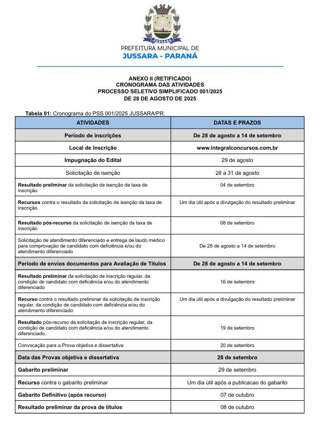 A Prefeitura Municipal de Jussara torna público o Anexo II (Retificado) referente ao cronograma das atividades do Processo Seletivo Simplificado nº 001/2025, publicado em 28 de agosto de 2025.