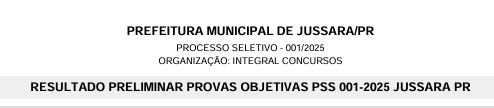 A Prefeitura Municipal de Jussara, em parceria com a empresa Integral Concursos, divulga o Resultado Preliminar das Provas Objetivas do Processo Seletivo Simplificado nº 001/2025.