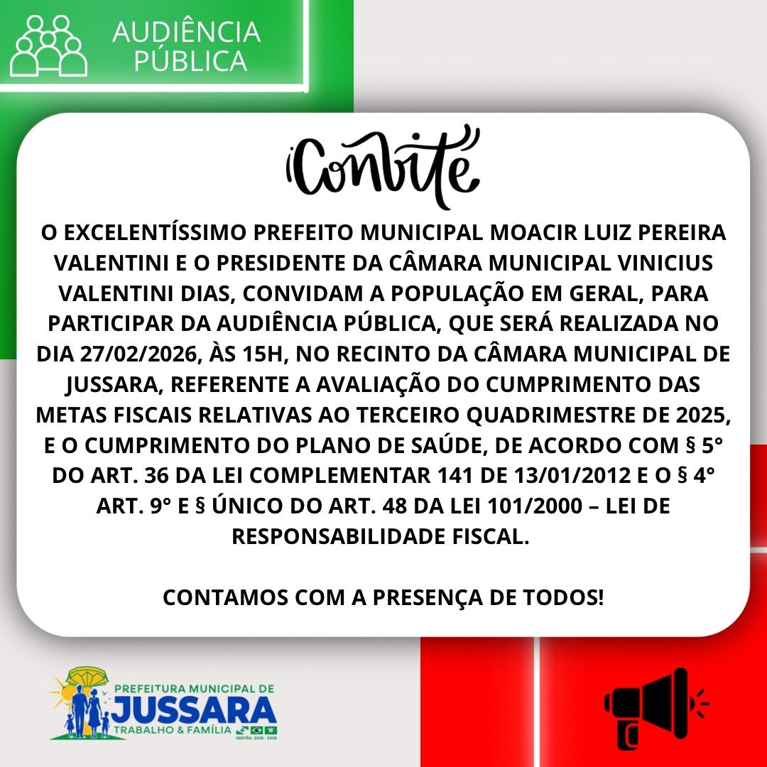 A Prefeitura Municipal de Jussara convida toda a população para participar da Audiência Pública que será realizada no dia 27 de fevereiro de 2026 (quinta-feira), às 15h, no recinto da Câmara Municipal.
